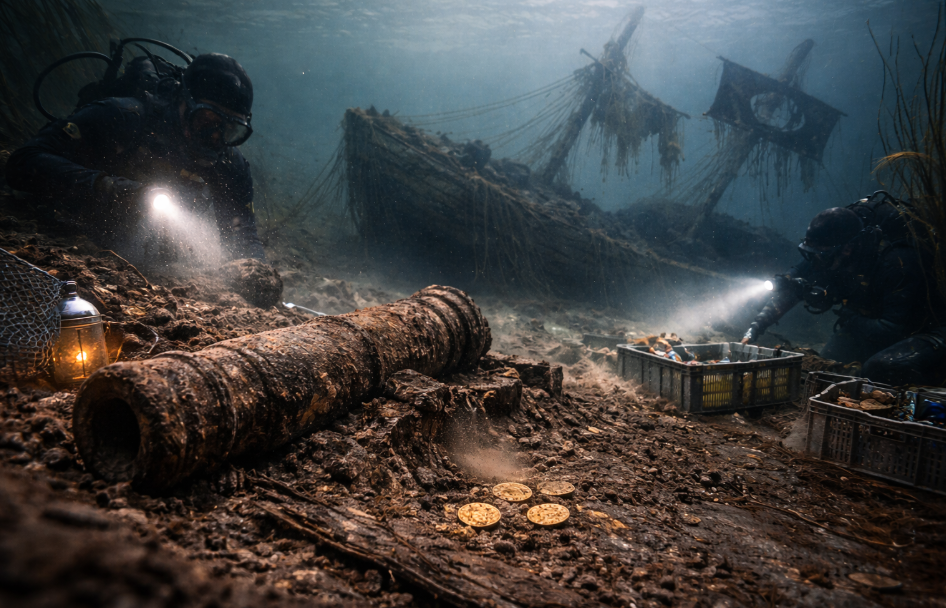 Lying partially submerged in the muck was a heavy, oxidized iron cannon. This isn’t a small swivel gun used for defense; it is a high-caliber weapon of war, typical of the 1600s. The presence of a cannon in the swamp is a historical bombshell. Pirates or military engineers wouldn’t leave such a valuable piece of firepower behind by accident. The condition of the ship suggests it was intentionally scuttled—stripped of its masts and sunk deep into the mud to act as a permanent, underwater vault. Why go to such lengths? The only logical answer is that the ship itself was the treasure chest, a massive vessel carrying a King’s ransom, hidden where no one would ever think to look.