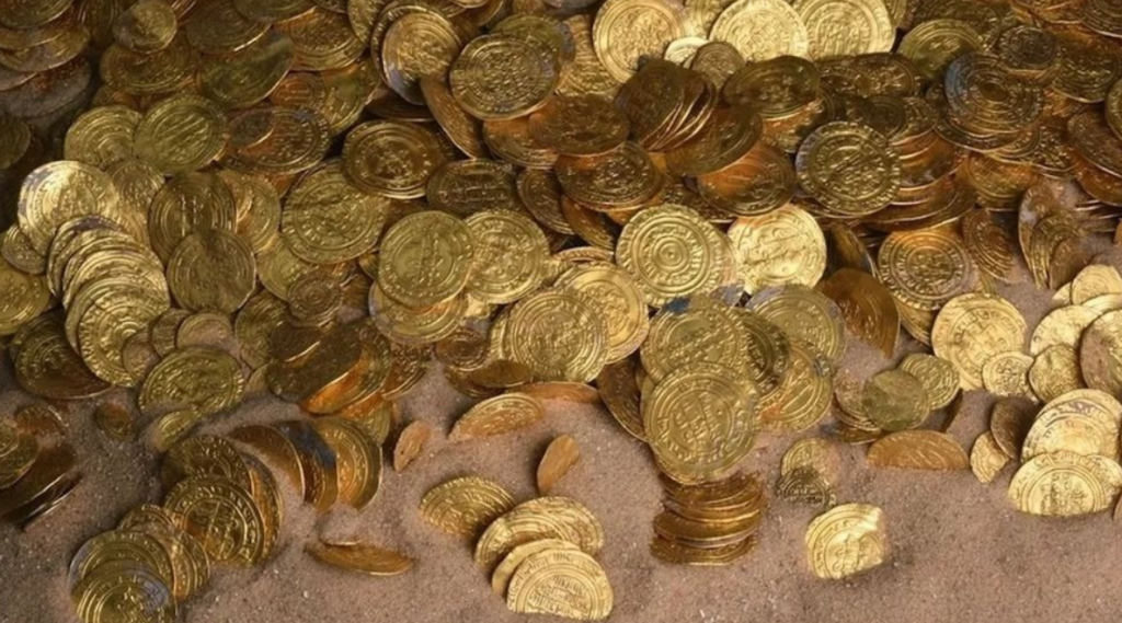 Not a single dramatic chest sitting in open view, but clustered flashes of yellow breaking through wet soil and shattered debris. Gold. Real gold. Loose coins, crushed containers, splintered timber, and ornate fragments tangled together in a scene that looked less like myth and more like history being torn open. The pirate hoard was no longer a fantasy. It was there.