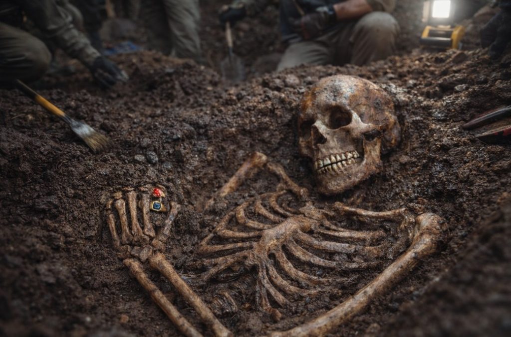 As the area was carefully uncovered, the team realized they were looking at a nearly complete human skeleton. The remains were found partially buried in the tunnel floor, surrounded by compacted earth and rock. Nearby soil also contained small metallic objects and fragments that suggested the location may once have been disturbed or used during earlier excavation attempts.