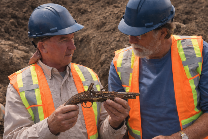 Buried beneath compacted layers of earth and debris, the team uncovered an ancient pistol whose shape, corrosion pattern, and worn construction immediately suggested great age. This was not the kind of object that quietly fits into the background of Oak Island’s mystery. It carried presence. It looked like a weapon meant to travel, to survive rough use, and to remain close to the hand of someone who expected danger.