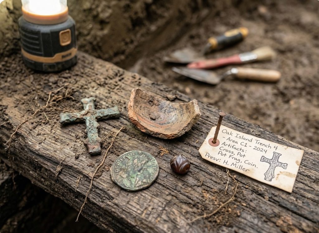 Lead archaeologist Dr. Alastair Richards noted that the pottery style was consistent with early European transport containers. More discoveries followed. A second pottery shard, thicker and older, suggested Lot 5 may have hosted settlement activity long before the Money Pit’s documented discovery in 1795.