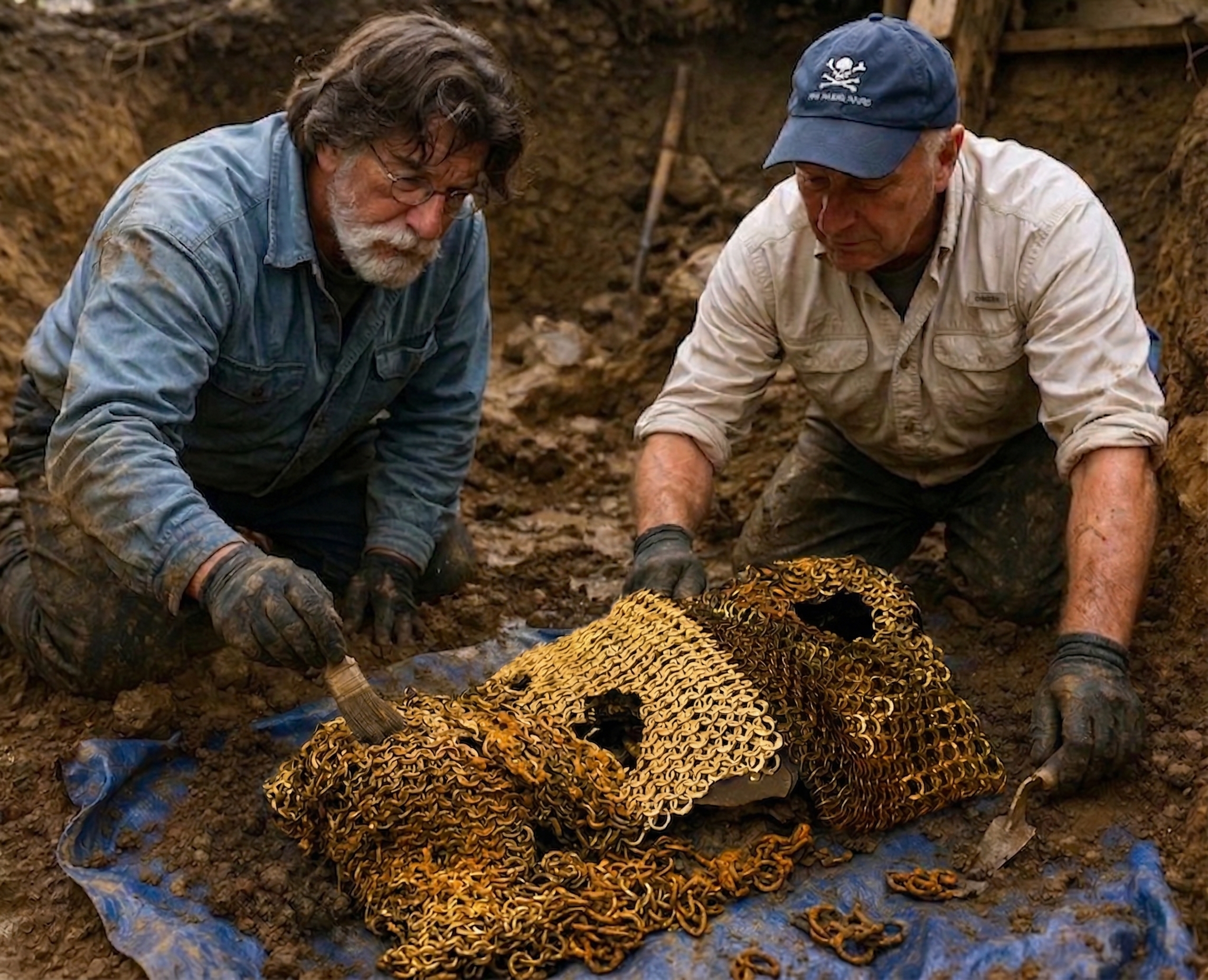 The moment Rick pulled the metal piece upward, the entire film crew held their breath. What lay buried in the soil was not just a fragment, but a substantial section of ancient chainmail armor. Although heavily corroded by time and salt, the distinct interlocking rings characteristic of the Middle Ages were unmistakable. This was not the equipment of early settlers, nor was it the gear of 18th-century pirates. These were the protective garments of holy warriors.