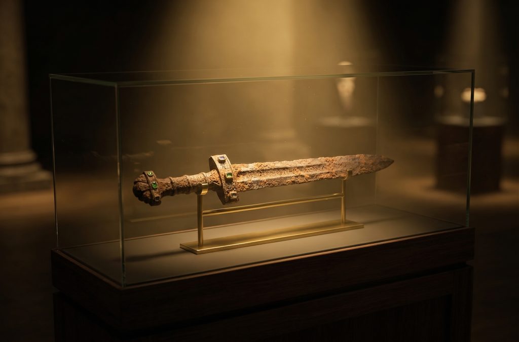 The hilt was wrapped in gold wire and embedded with large uncut gems, while the blade, unlike any traditional metal, was forged from meteoric iron—an ancient metal prized for its celestial origins. The sword was not just any weapon; it was a symbol of the immense knowledge and power possessed by the ancient civilizations that may have hidden it there.